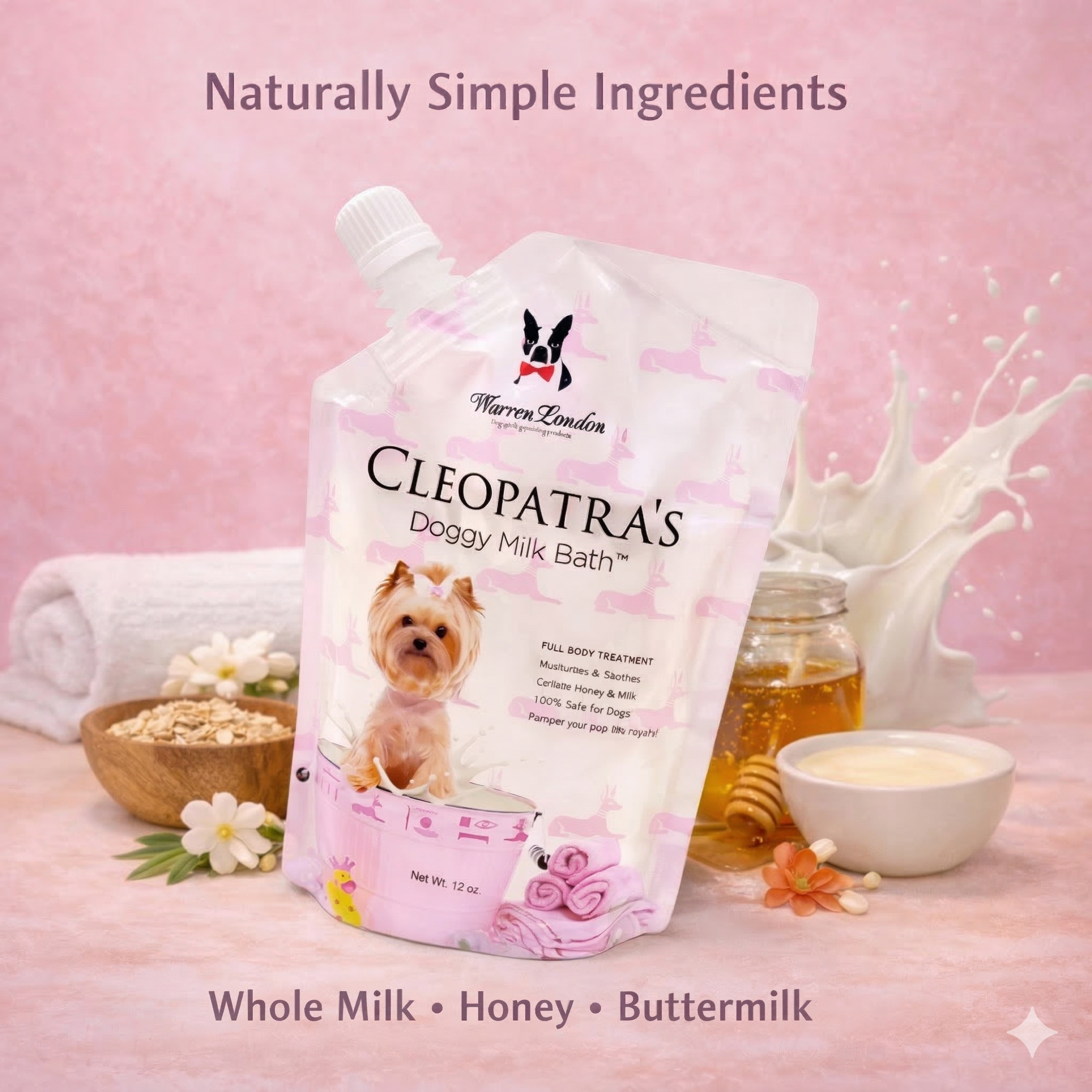 Perfect for dogs with dry or itchy skin, this luxury spa treatment begins with a gentle exfoliating butter wash, followed by a soothing oatmeal shampoo and a nourishing honey and milk bath soak to calm and hydrate the skin. The treatment is finished with a lightweight, non-greasy hydrating cream to moisturise the skin and coat, plus a butter balm applied to any areas of dryness or irritation for extra relief.