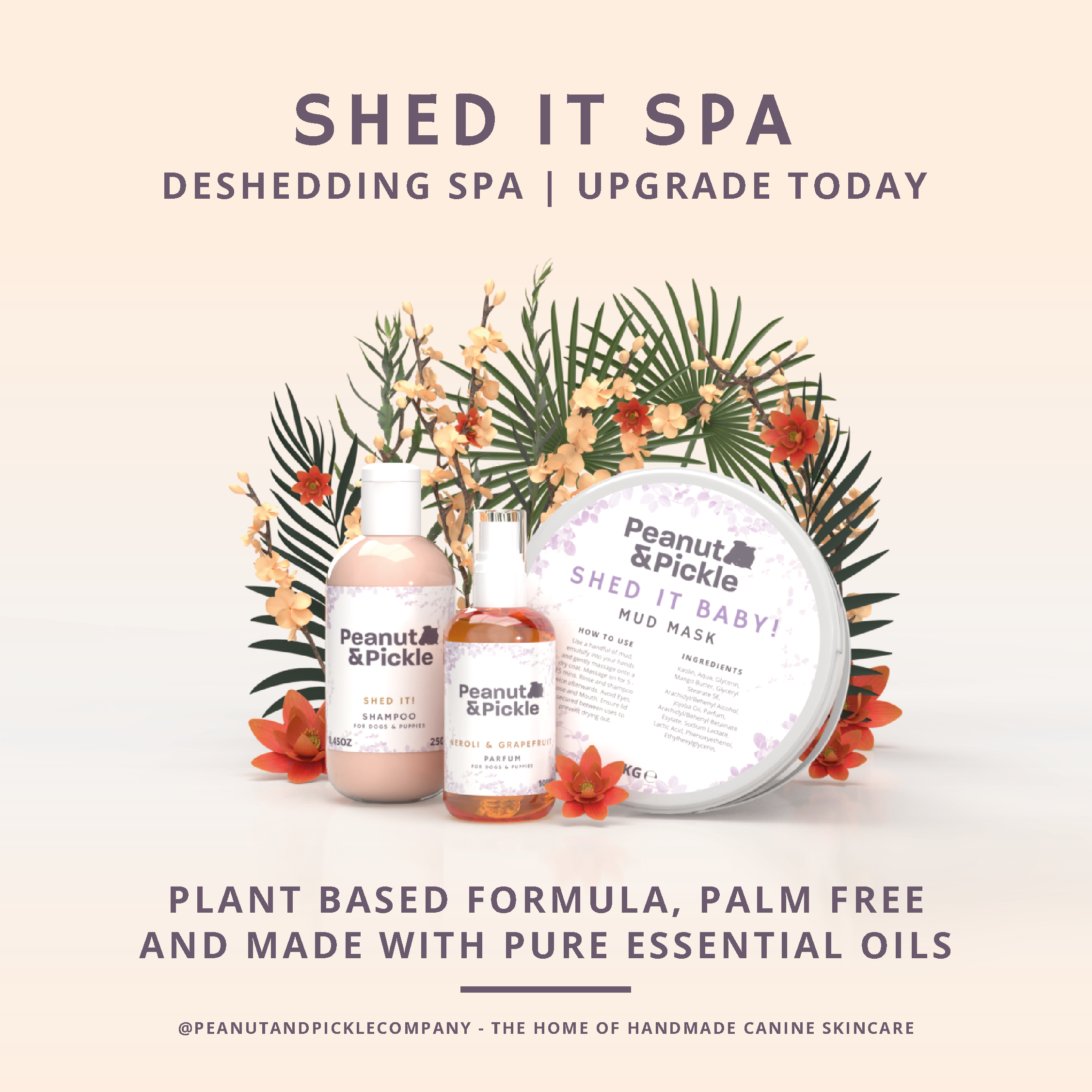 Reduce shedding and keep your dog’s coat looking its best with our Peanut & Pickle Shed It Spa treatment. This add-on uses a specially formulated shampoo, a deep-penetrating mud mask, and a deshedding spray to help loosen dead hair and remove excess undercoat. The treatment works through the coat to lift away loose fur while nourishing and conditioning the hair.