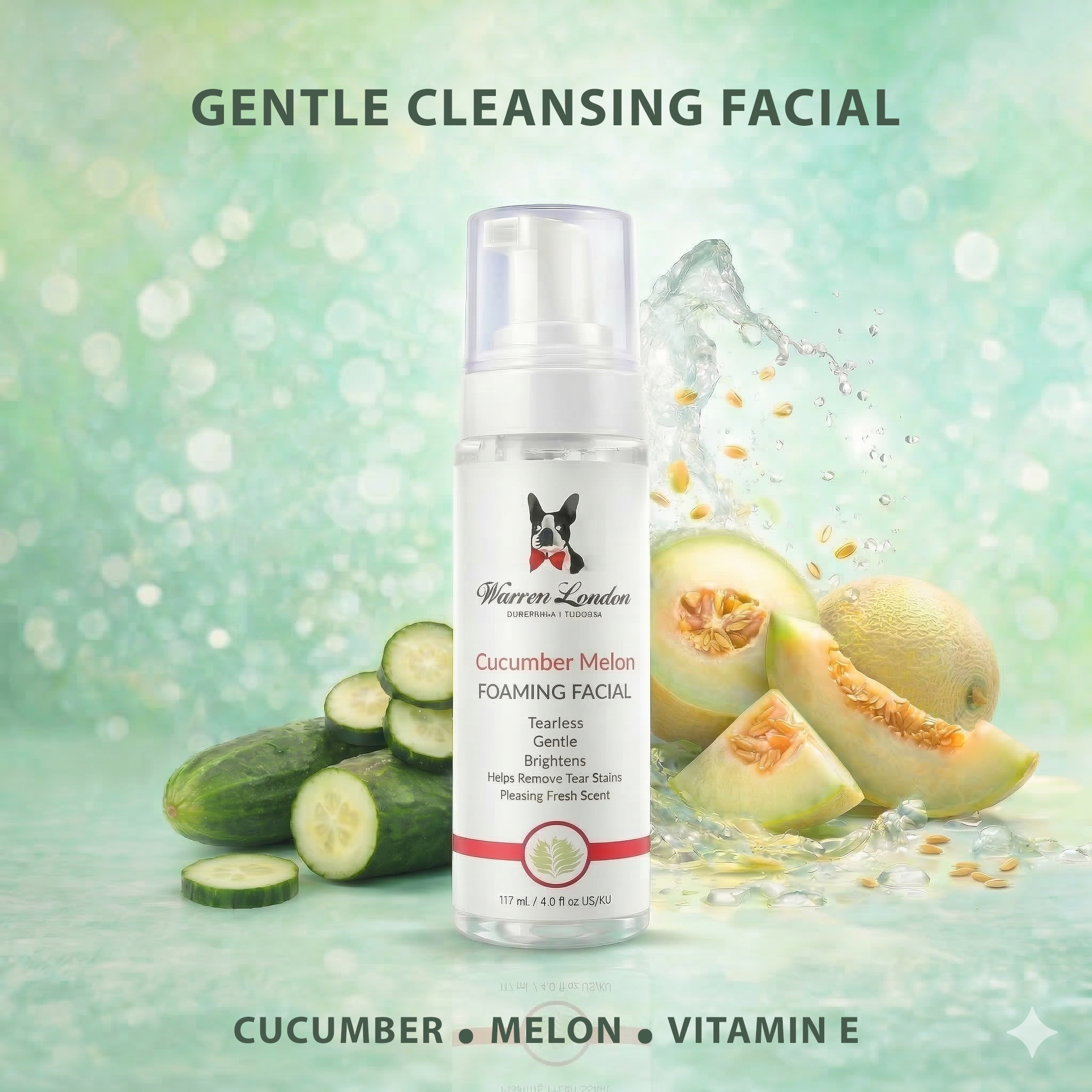 Our Cucumber & Melon Facial is a refreshing treatment suitable for all dogs. This gentle facial helps cleanse away dirt and buildup around the face and eyes while soothing and refreshing the skin. The light cucumber and melon formula leaves the face clean, soft, and fresh, and the treatment is finished with a nourishing nose balm to moisturise and protect dry noses.